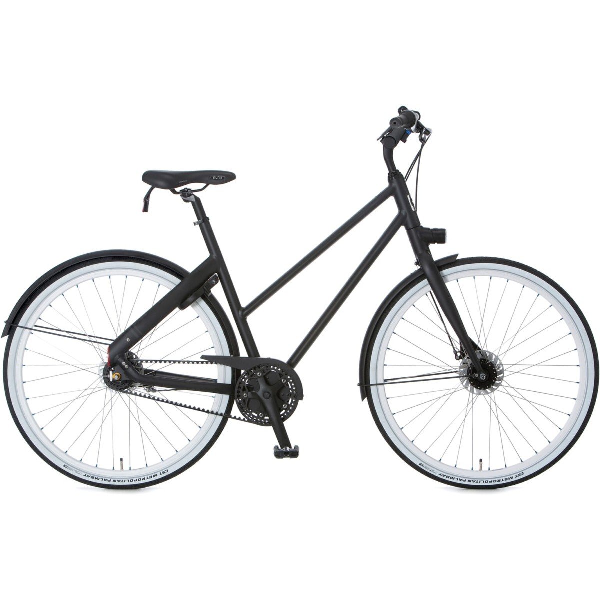 Cortina Blau damesfiets in framemaat 56cm. Kleur: Black Matte. Uitgerust met achter een Shimano Nexus 7 traps versnellingsnaaf met rollerbrake en voor een Shimano naafdynamo met rollerbrake. Opvallende details: aluminium frame, Gates belt drive type CDN, in frame geintegreerde verlichting. Let op: deze uitvoering heeft geen Cortina USB-stuurpen. Kleurcode: UZZ 0001 Matte.