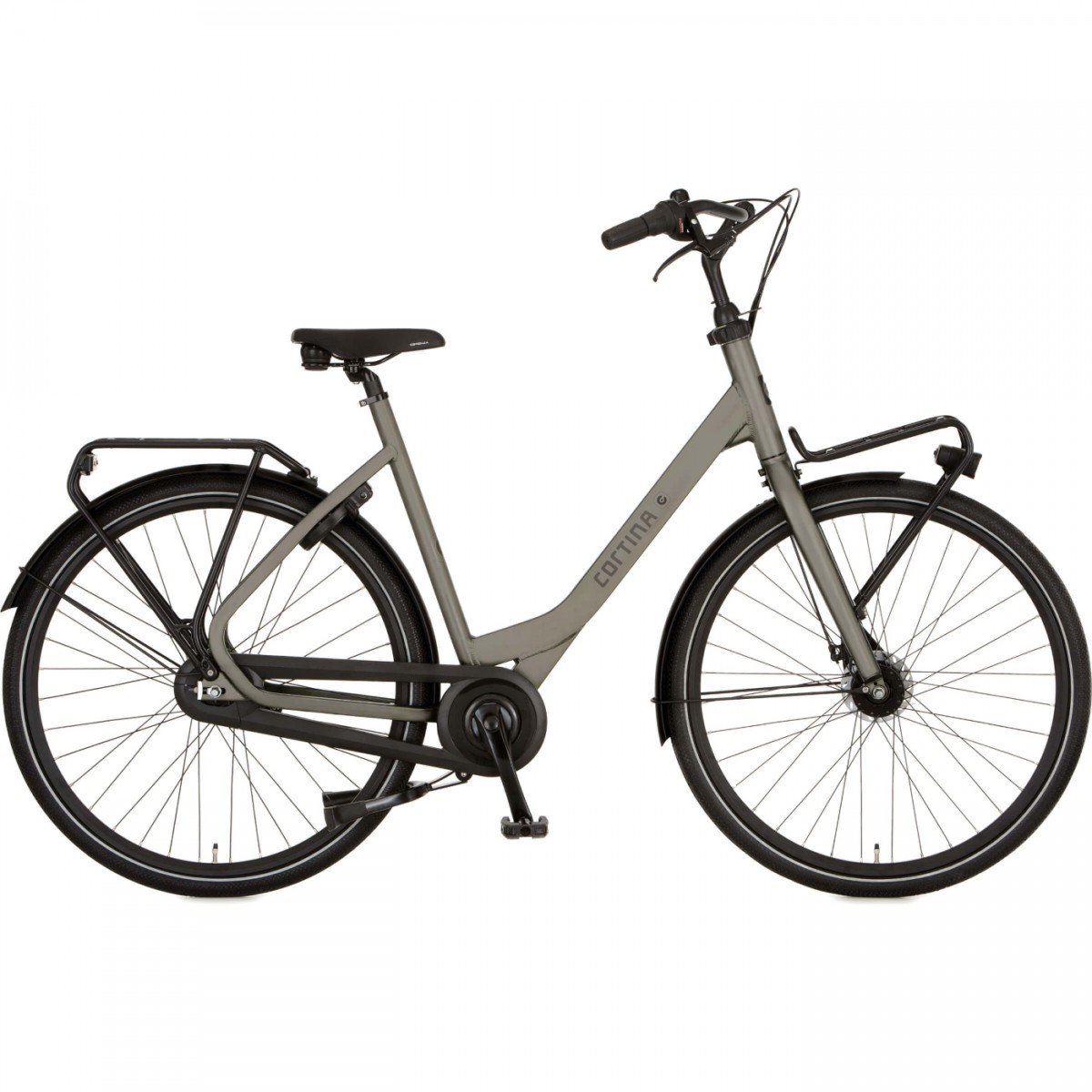 Cortina Common damesfiets in framemaat 50cm. Kleur: Quartz Grey Matte. Uitgerust met achter een Shimano Nexus 7-traps versnellingsnaaf met rollerbrake en voor een Shimano naafdynamo met rollerbrake. Opvallende details: aluminium frame, stuurslot, voordrager.