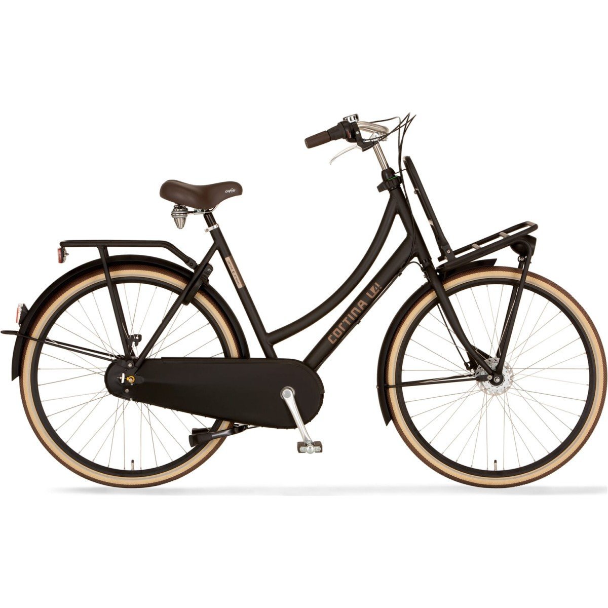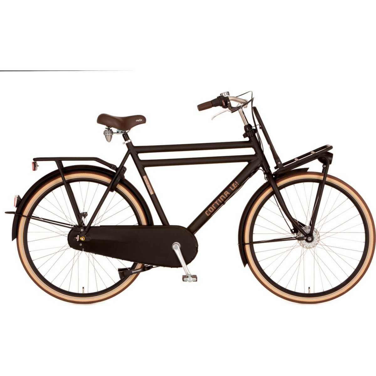 Cortina Transport U4 damesfiets in framemaat 50cm. Kleur: Jet Black Matte. Uitgerust met achter een Shimano Nexus 7-traps versnellingsnaaf met rollerbrake en voor een Shimano naafdynamo met rollerbrake. Opvallende details: aluminium frame, stuurslot, voordrager. Kleurnummer: UZZ 69005 Matte.